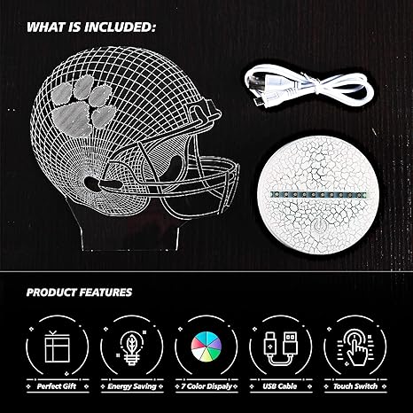 Bigfootstudio 3d Led Night Light Football Helmet Clemson Tigers Flat Acrylic Illusion Lighting Lamp With 7 Colors And Touch Sensor Sports Fan Nightlight Gift For Kids Boys Girls Men Or Women