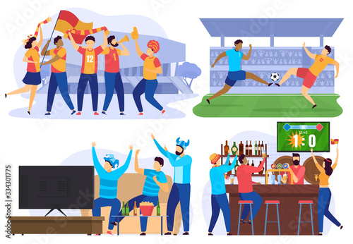 Soccer Players And Football Fans Cheering In Bar People Cartoon Characters Vector Illustration Sport Game Competition On Stadium Friends Watching Football On Tv Together Soccer Match Championship Buy This Stock Vector