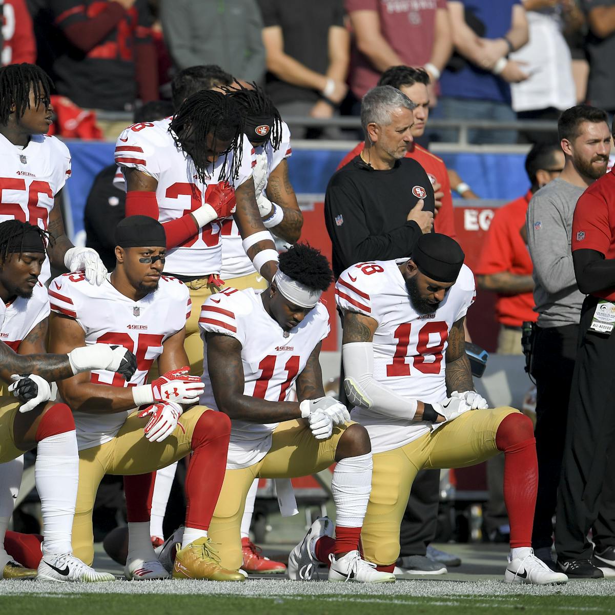 Football Players Kneeling On Soldiers